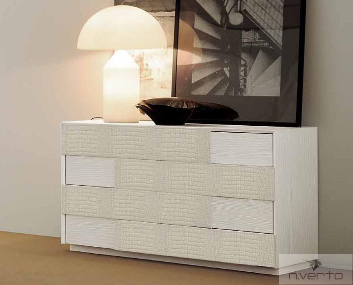 Еще одно интересное дизайнерское решение SMA design - лицевая часть комода и тумб, по желанию клиента, обивается кожей либо экокожей в виде кожи каймана. В данной модели возможна установка ящика для белья со стандартным открытием и с горизонтальным.
